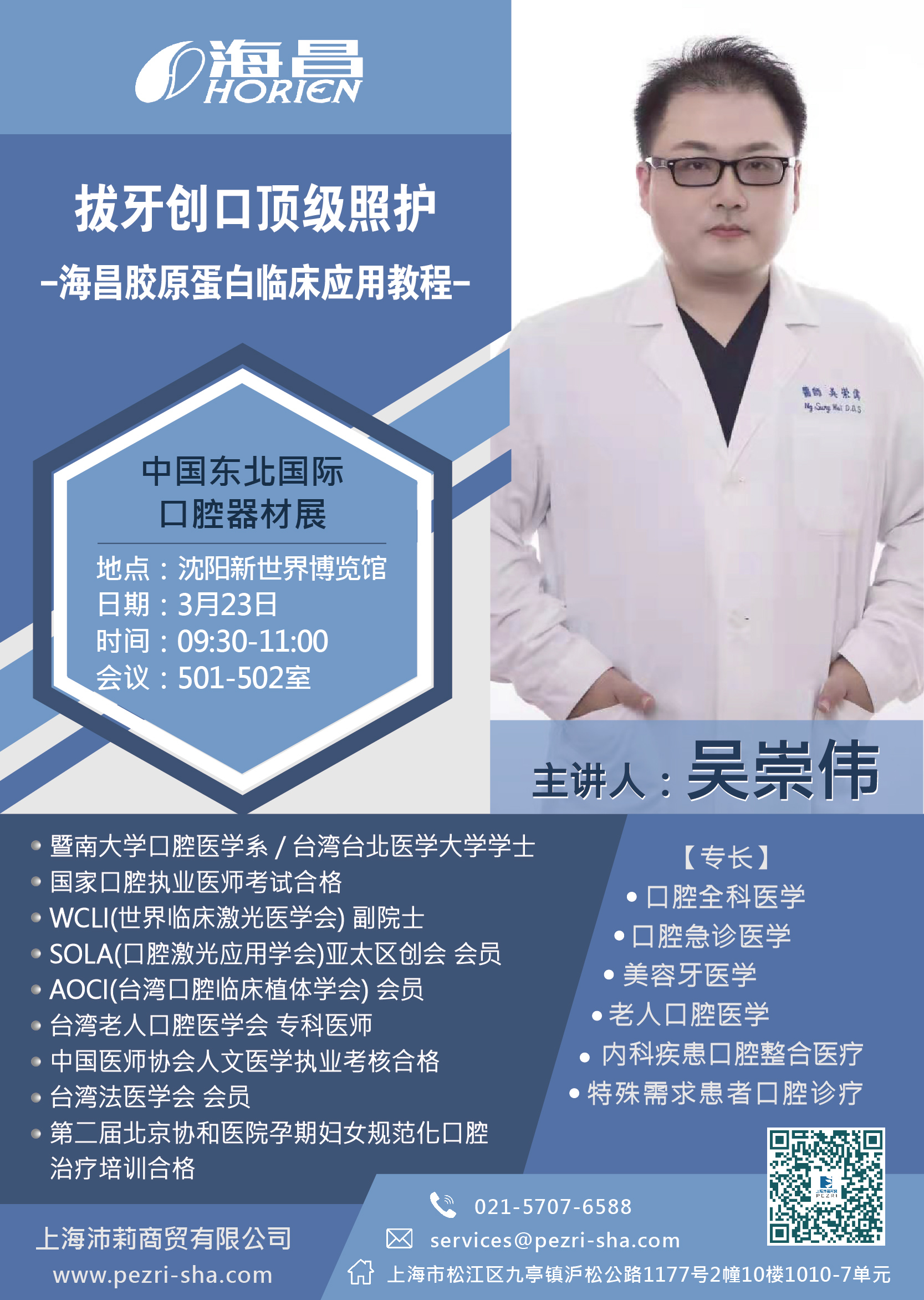 上海沛莉商贸携手海昌生化科技,将在此次展会邀请重量级讲师授课分享,解析胶原蛋白应用于微创植牙/牙周之软硬组织处理,以及口腔手术应用,提供牙科术式解决方案与门诊经营,邀请您一同深刻交流。上海沛莉商贸将在本次东北国际口腔展中带来胶原蛋白产品优惠活动,我们在4楼U18展位等您。