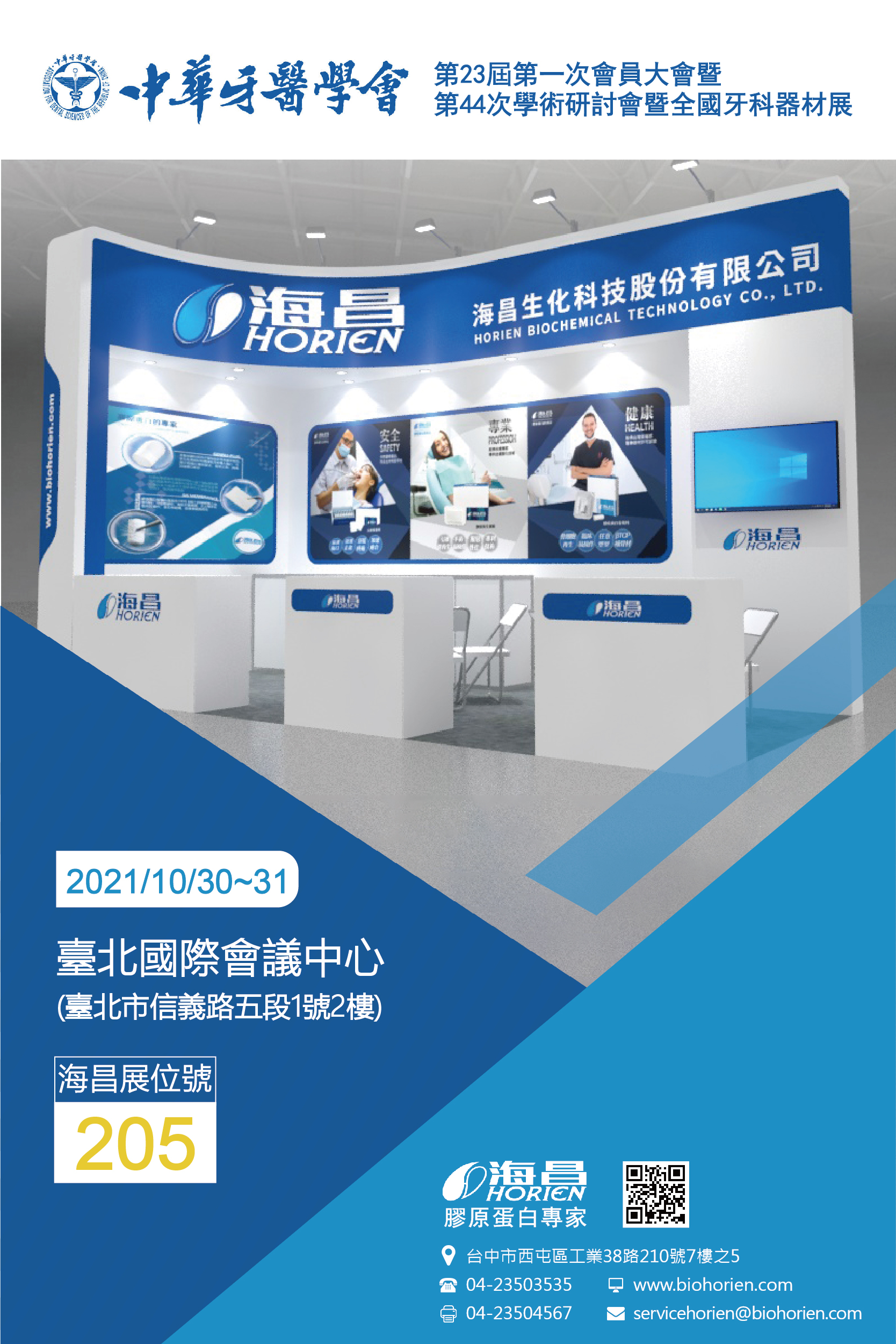 2021年中华牙医学会第23届会员大会即牙科器材展即将在台北国际会议中心隆重登场,引领齐盼的牙材展即将开幕,医师们请把握机会踊跃参加!! 海昌祭出胶原蛋白等多项产品优惠及免费好礼送给您~~海昌展位号#205,我们不见不散!!
